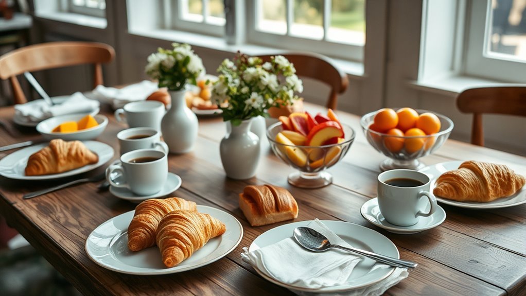 Presentation, decor, and set-up expenses can considerably impact your breakfast catering budget, as they set the tone and atmosphere for the event. Your choice of tableware selection influences the overall aesthetic and can elevate the dining experience. Thoughtful lighting design enhances ambiance, making the setting warm and inviting. To optimize your budget, consider these key factors: