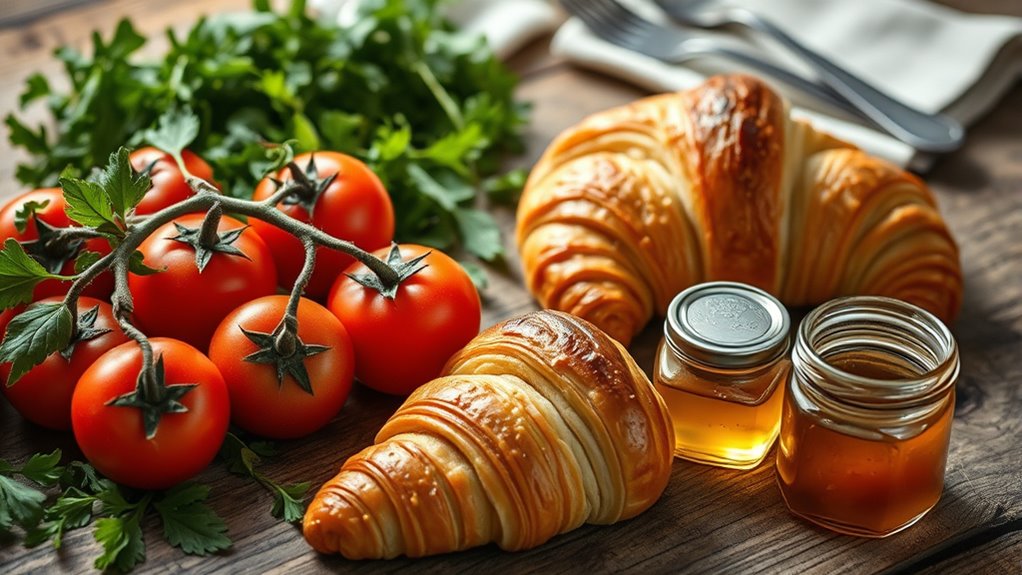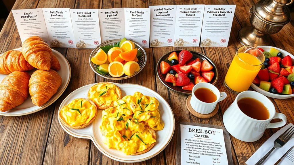 Enhancing your breakfast catering with gourmet additions and extras allows you to elevate the meal experience and impress your guests. Gourmet toppings, like flavored creams, artisanal jams, and exotic fruits, add a touch of sophistication to standard dishes. Including premium condiments, such as high-quality honey, infused oils, or specialty hot sauces, can transform simple items into memorable bites. These extras often come with additional costs but provide a luxurious feel that can justify a higher price point. When budgeting, consider the variety and quality of gourmet toppings and condiments you want to offer, as they can considerably influence overall expenses. Incorporating these premium options helps create a more refined breakfast experience that leaves a lasting impression.