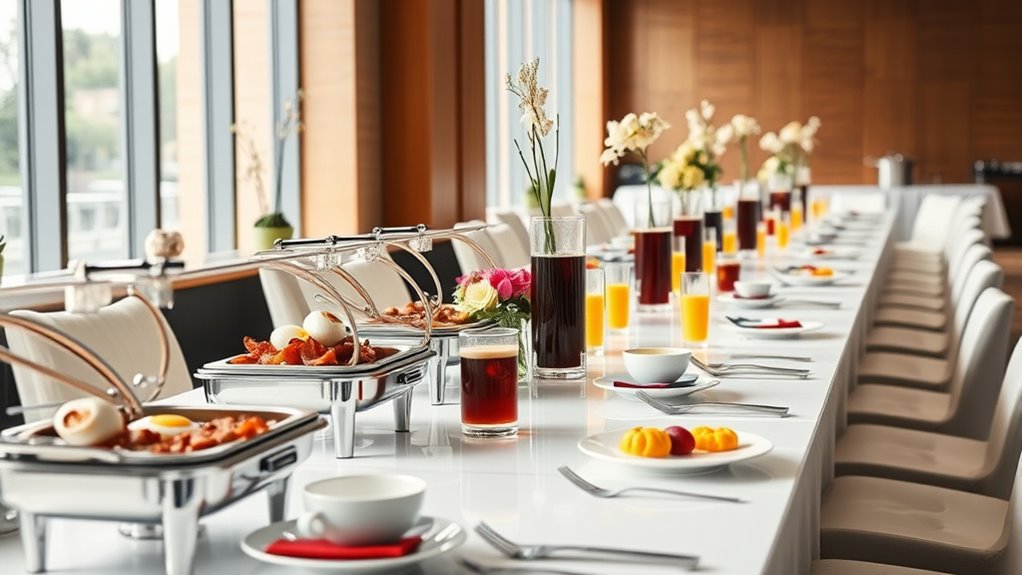 Organizing a successful breakfast event requires careful planning and seamless coordination to guarantee everything runs smoothly. Start by focusing on menu presentation; ensure dishes are attractive and easy to serve, creating an inviting atmosphere. Clear signage and organized buffet layouts help guests navigate choices efficiently. Equally important is staffing coordination—assign roles clearly so staff can manage food replenishment, guest inquiries, and cleanliness without confusion. Communicate your schedule with caterers and team members ahead of time to avoid delays. Confirm delivery times, setup logistics, and service timelines to keep the event on track. Attention to detail in both menu presentation and staffing ensures a fluid experience, leaving guests satisfied and your event running flawlessly from start to finish.