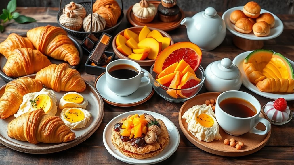 Breakfast menus around the world showcase a diverse array of flavors and ingredients that reflect local cultures and traditions. You’ll notice international flavors blending with traditional recipes, creating unique offerings that appeal to diverse tastes. For example, a classic American breakfast might feature fluffy pancakes paired with maple syrup, while a Mediterranean menu could include savory shakshuka or fresh pita with hummus. Asian-inspired options like congee or bao buns are increasingly popular, highlighting global influences. These dishes demonstrate how breakfast catering adapts traditional recipes to incorporate international ingredients and techniques. By embracing these global influences, you can offer customers a vibrant, eclectic selection of breakfast items that celebrate cultural diversity and satisfy a wide range of preferences.