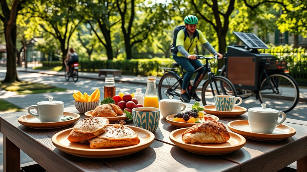 To make your breakfast catering more sustainable, focus on sourcing locally and seasonally to reduce transportation emissions and support local farmers. Minimize food waste by planning portions carefully and donating leftovers. Choose eco-friendly packaging and reusable utensils to cut down on waste, and use energy-efficient appliances to save power. Incorporate plant-based options to lower environmental impact, and opt for responsible delivery methods like electric vehicles or bikes. Exploring these practices further can help you create greener, more responsible catering.
