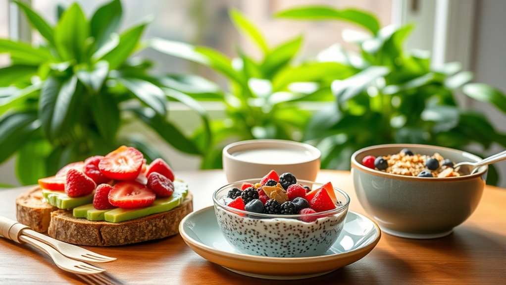 Adding plant-based options to breakfast catering not only appeals to a wider range of dietary preferences but also considerably reduces environmental impact. Incorporating plant-based proteins like tofu, tempeh, and legumes provides nutritious, sustainable alternatives to traditional animal products. Meat alternatives such as veggie sausages, patties, and scrambled tofu mimic familiar textures and flavors, making them easy for guests to enjoy. By offering these options, you support reduced greenhouse gas emissions, conserve water, and lower land use associated with meat production. You can easily integrate these choices into menus, appealing to vegetarians, vegans, and flexitarians alike. Emphasizing plant-based options demonstrates your commitment to sustainability while satisfying diverse tastes, making your breakfast catering more environmentally responsible and inclusive.