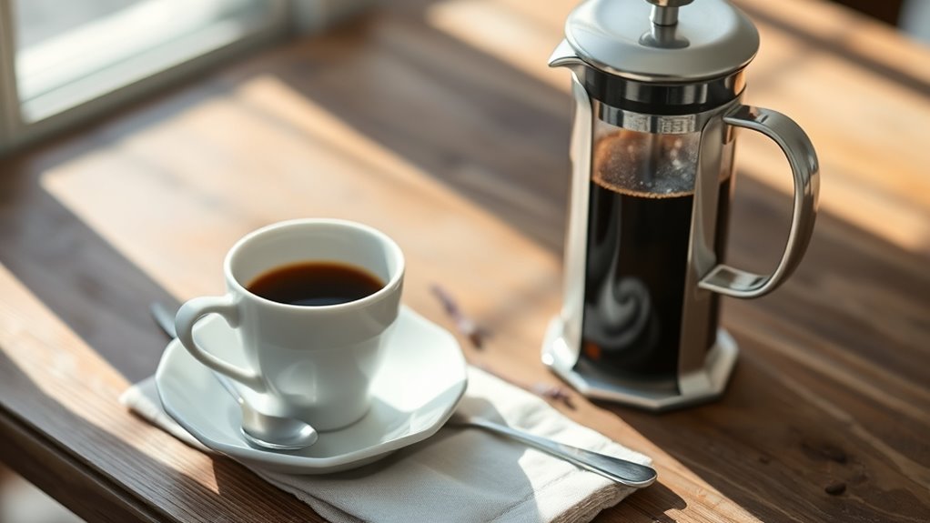 Brewing coffee the French way emphasizes simplicity and quality, focusing on extracting rich flavors from carefully selected beans. You’ll want to master classic coffee brewing techniques that highlight the elegance of French breakfast etiquette. First, choose high-quality, freshly ground coffee beans. Second, use a stovetop Moka pot or French press to preserve flavor. Third, heat water to just below boiling to avoid bitterness. Fourth, pour the coffee slowly, savoring the aroma. This method encourages mindfulness and appreciation for each sip. The French approach values understated elegance—no unnecessary gadgets or elaborate steps. Instead, the focus remains on the coffee’s purity and aroma, aligning perfectly with the artful simplicity that defines a true French breakfast. Paying attention to seasonal variations can also enhance the overall experience.