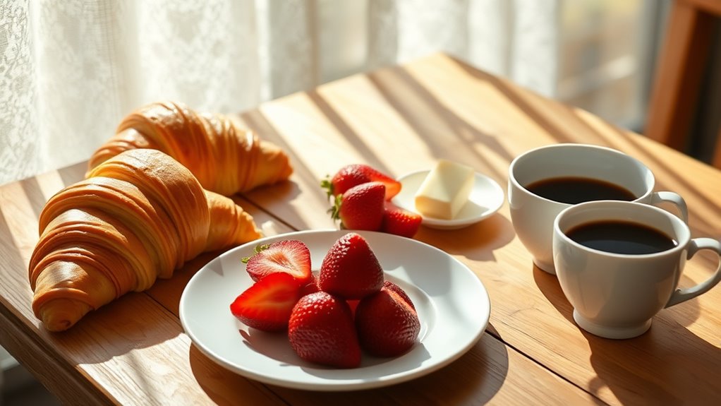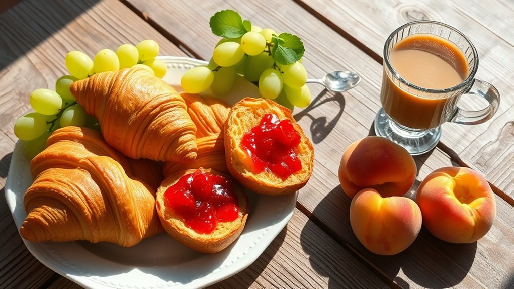 To truly enjoy a French breakfast, you’ll want to start with freshly baked breads that are warm and crusty. Pair them with high-quality preserves that add just the right touch of sweetness, and don’t forget a cup of rich, aromatic coffee to complete the experience. These simple ingredients are the essentials for an authentic taste of France.