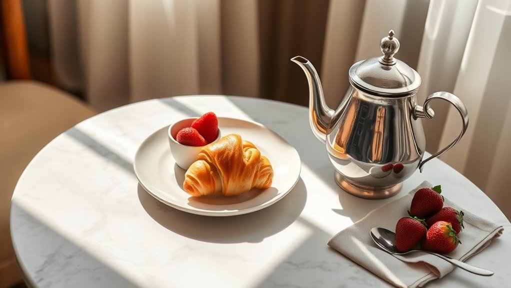 To create a truly relaxed morning ritual, start by setting aside a few quiet moments just for yourself before diving into the day. This is where morning mindfulness begins—taking a deep breath, feeling present, and appreciating the slow start. Establish relaxing routines that ground you, like savoring a cup of coffee or tea without distractions. Avoid rushing; instead, focus on gentle activities that soothe your mind, such as stretching or journaling. Keep your environment calm—soft lighting, calming music, or fresh flowers can enhance the atmosphere. By intentionally carving out these peaceful moments, you cultivate a sense of ease that carries through your day. Incorporating slow start techniques such as mindful breathing or gentle stretching can further enhance your morning experience. A thoughtful, relaxed start sets the tone for a simple, elegant French breakfast experience.