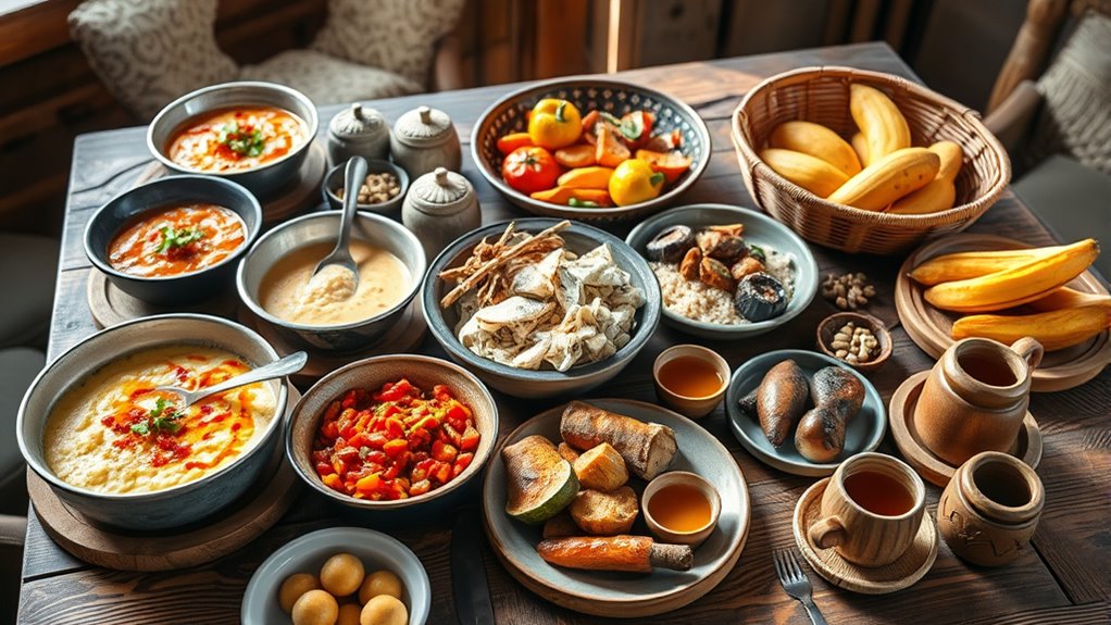 Ever wondered what fuels the start of a day across Africa? You’ll find that breakfast routines vary widely, but coffee varieties are a common energizer. In Ethiopia, you might savor a cup of rich, aromatic coffee from the highlands, often prepared using traditional methods like the jebena. In North Africa, strong, spiced coffee like Turkish coffee is popular. Breakfast etiquette emphasizes communal sharing; families often gather around a table, enjoying simple, hearty foods like porridge or flatbreads paired with honey or yogurt. Coffee isn’t just a beverage—it’s a social ritual that fosters connection. Whether sipping coffee slowly or eating quickly before heading out, Africans value warmth, hospitality, and the importance of starting the day with nourishment and community. Incorporating traditional dining customs can enrich the breakfast experience and reflect the region’s cultural identity.
