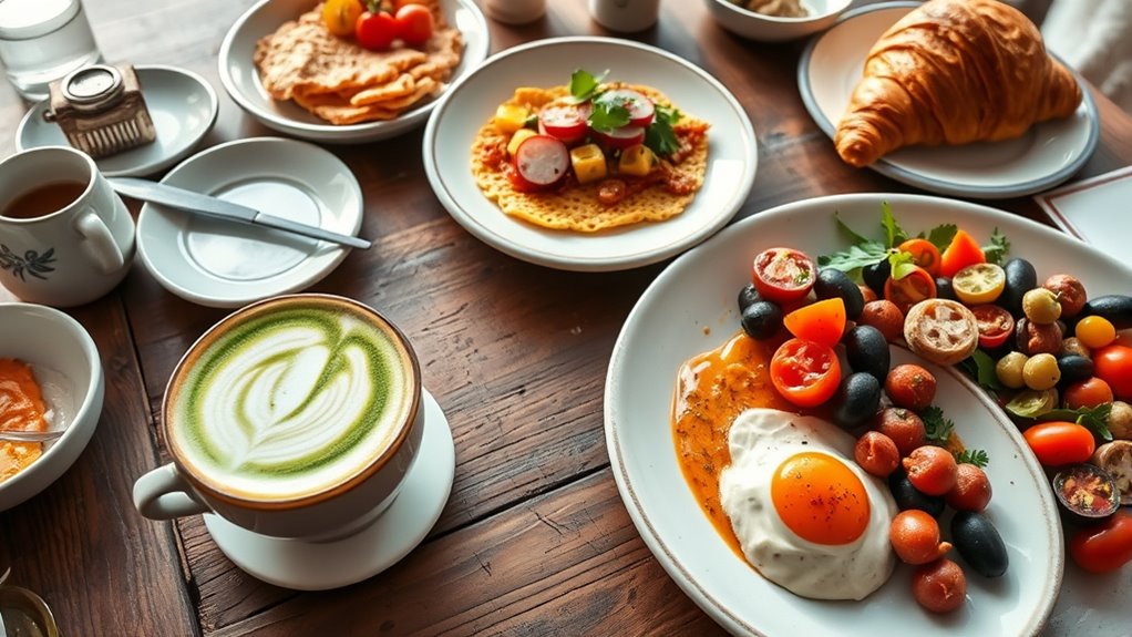 Across Africa, coffee rituals often center around community and warmth, and this spirit continues into the Middle East, where breakfast flavors are rich with tradition and bold tastes. You’ll find a variety of bread varieties like pita, saj, and flatbreads that serve as the perfect base for savory spreads. Spice blends such as za’atar, baharat, and sumac add depth and aroma to dishes, creating vibrant flavors. Middle Eastern breakfasts often include ingredients like labneh, hummus, and olives, complemented by fresh vegetables. To truly experience this cuisine, focus on these key elements: