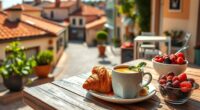 A typical European breakfast often features a simple yet satisfying array of staples. You’ll find bakery pastries like croissants or brioche, paired with fresh dairy products such as butter, cheese, and yogurt. These items provide a rich start to your day, emphasizing quality and freshness. To understand the variety, consider this table: