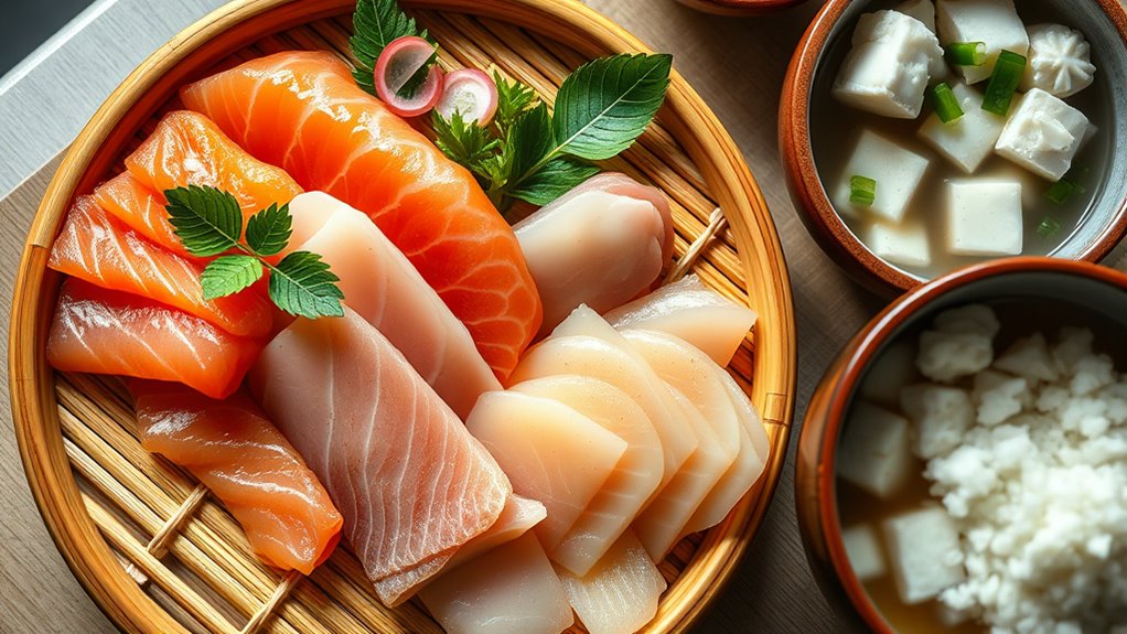 How can you tell if fish is fresh enough for your Japanese asa-gohan? First, check the eyes—they should be clear, shiny, and slightly bulging. The gills need to be bright red or pink and free of slime. Smell the fish; it should have a clean, ocean-like aroma, not a strong, ammonia scent. Look for firm flesh that springs back when pressed. Prioritize fish from sustainable fishing sources to support ocean health and ensure quality. Fresh fish should be properly preserved, kept cold, and handled with care to prevent spoilage. When selecting fish, trust your senses—sight, smell, and touch—to gauge freshness. Using the appropriate headphone connection can enhance your experience of preparing and enjoying your meal through clear audio guidance or entertainment. Choosing well-preserved, sustainably caught fish guarantees a delicious, nutritious start to your traditional Japanese breakfast.