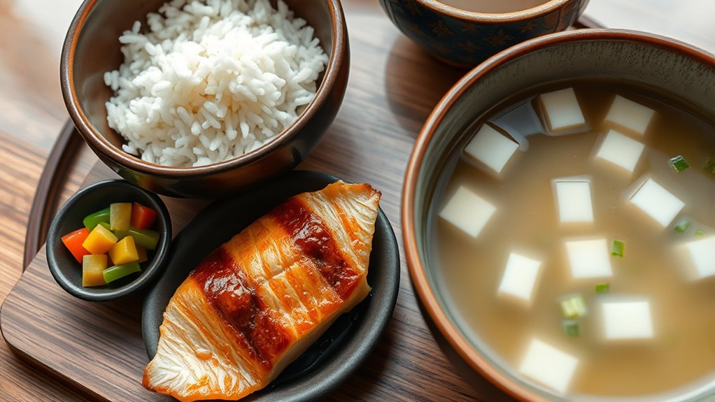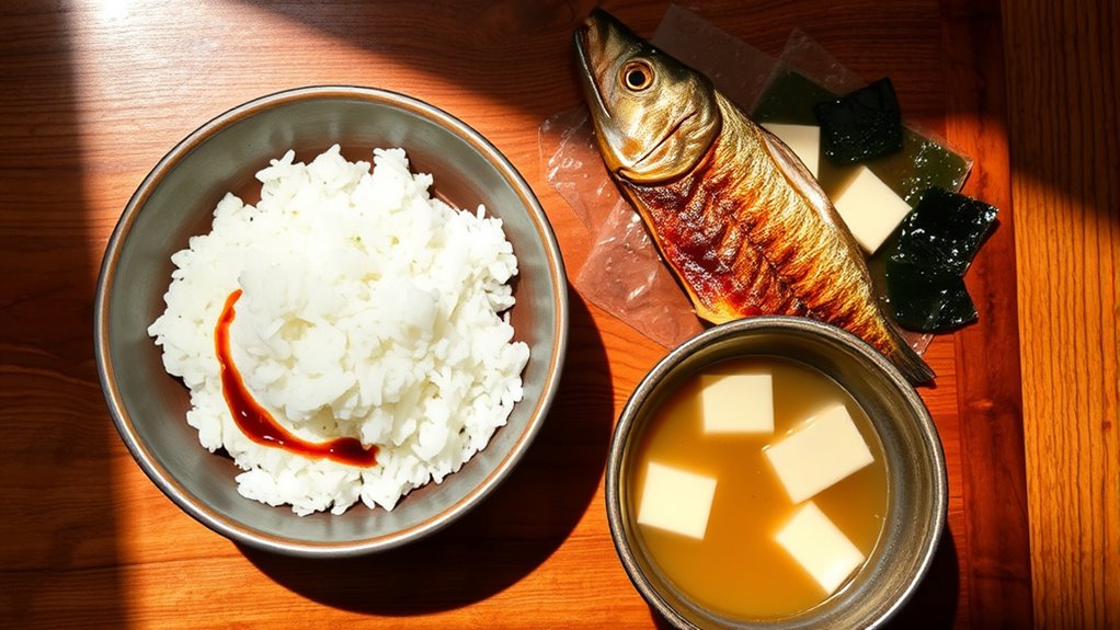 While the traditional practice of asa-gohan remains an essential part of Japanese culture, many people have adapted it to suit modern lifestyles. Today, fusion cuisine combines the classic elements with global flavors, creating innovative dishes that respect tradition while appealing to diverse tastes. You might find vegan adaptations replacing fish with plant-based proteins or using miso made from different grains to suit dietary preferences. These modern takes preserve the ritual’s essence—mindful eating and balance—while embracing convenience and creativity. Restaurants and home cooks alike experiment with new ingredients, blending traditional rice, fish, and miso soup into contemporary, health-conscious meals. This evolution guarantees asa-gohan remains relevant, offering both cultural respect and flexibility for today’s diverse culinary landscape. Additionally, second trimester overview highlights how evolving dietary habits can support pregnant women in maintaining balanced nutrition.