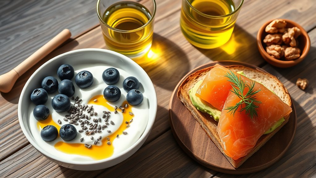 Since omega-3 fatty acids are essential for maintaining ideal brain function, incorporating them into your breakfast can give your mental clarity a real boost. You can do this by adding foods rich in fish oils or flaxseed benefits to your morning meal. Fish oils are a direct source of EPA and DHA, key omega-3s that support cognitive health. Flaxseeds are a plant-based option, providing alpha-linolenic acid (ALA), which your body converts into usable omega-3s. To maximize these benefits, try these ideas: