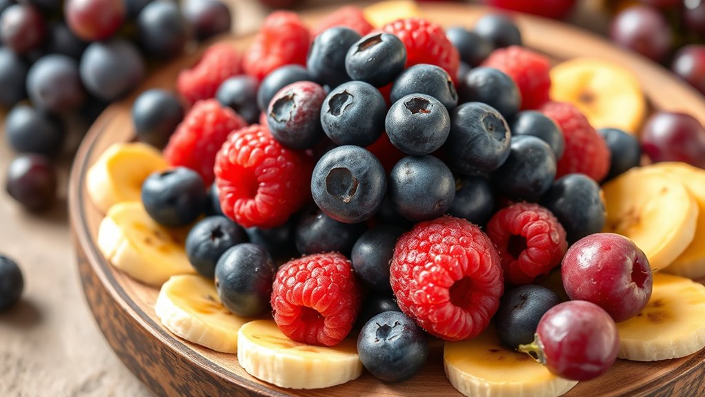 Have you ever wondered how berries boost your brain health? Their antioxidant properties play a key role in protecting your brain cells from oxidative stress, which can impair cognitive function over time. Different berry varieties, like blueberries, strawberries, and blackberries, are packed with nutrients that support memory and mental clarity. These fruits contain flavonoids that improve blood flow to the brain, enhance neural communication, and promote neuroplasticity. Consuming berries regularly can help reduce inflammation and combat age-related cognitive decline. Additionally, the presence of polyphenols in berries may also influence brain-derived neurotrophic factor (BDNF) levels, which are crucial for brain plasticity and learning. Plus, their natural sweetness makes them a delicious addition to your breakfast. Incorporating a variety of berries into your morning meal gives your brain a powerful boost of antioxidants, setting a positive tone for mental performance throughout the day.