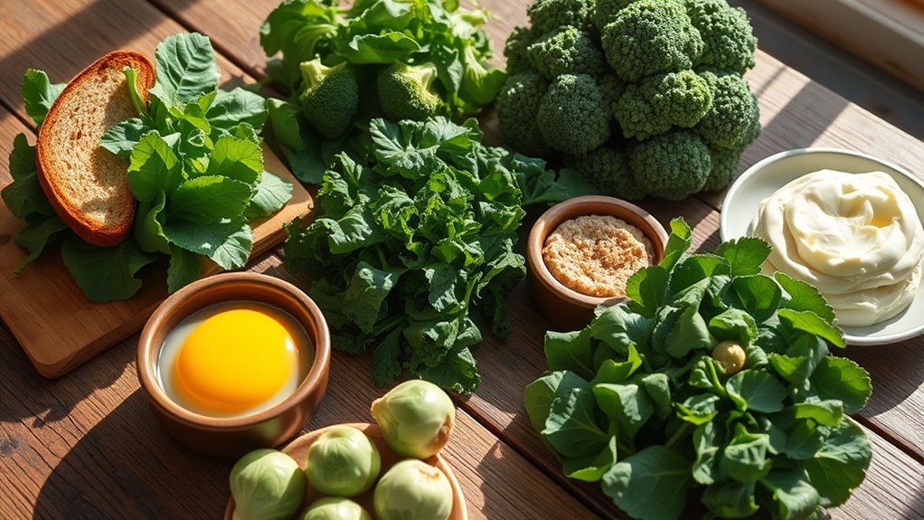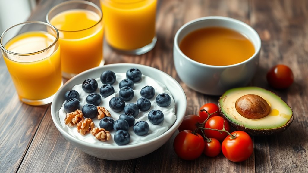 To boost your cognitive function at breakfast, prioritize whole grains like oats or whole wheat for steady energy, and add berries rich in antioxidants to protect brain cells. Incorporate eggs for choline, nuts, and seeds like walnuts and chia for healthy fats, and include leafy greens and cruciferous vegetables for essential nutrients. Don’t forget omega-3 sources such as flaxseeds or fish oil. Continue exploring to discover how these foods can optimize your mental clarity all day long.