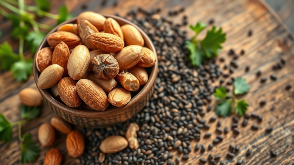 Including healthy fats from nuts and seeds is essential for maintaining sharp focus and supporting overall brain function. These foods are rich in Omega 3 sources and other healthy fats that enhance cognitive clarity and memory. The healthy fat benefits include improved neuron communication and reduced inflammation, which keeps your brain agile and alert. Imagine feeling more focused during work and sharper in conversations—these are the results of nourishing your brain with the right fats. To evoke emotion, consider how each bite strengthens your mental resilience and helps you stay ahead. Here’s a quick look at some nut and seed options: