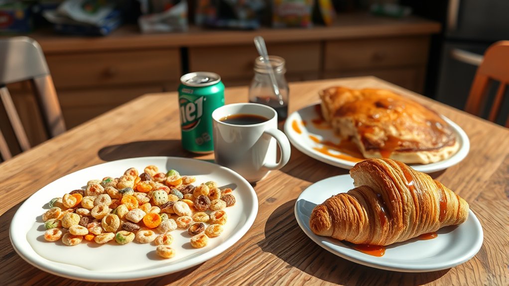 While choosing nutrient-rich foods can boost your mental sharpness, certain common breakfast habits can actually drain your energy instead. Many people buy into fasting misconceptions, believing skipping breakfast saves energy or promotes weight loss, but this often leads to fatigue and decreased focus later. Breakfast myths also persist, like the idea that a sugary, carb-heavy meal provides lasting energy; in reality, it causes an energy crash. Eating too little or relying on processed foods can leave you feeling sluggish. Overconsuming caffeine early on might temporarily boost alertness but can lead to crashes and dehydration. Incorporating balanced, high-protein options and healthy fats can help sustain your energy levels throughout the day. Recognizing these pitfalls helps you avoid draining habits and set a foundation for sustained energy throughout your day.