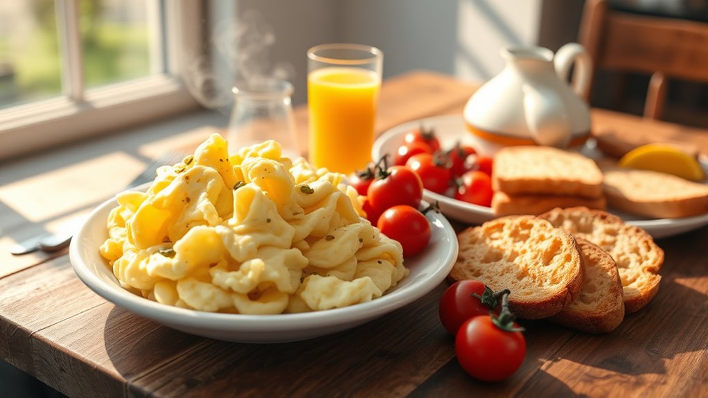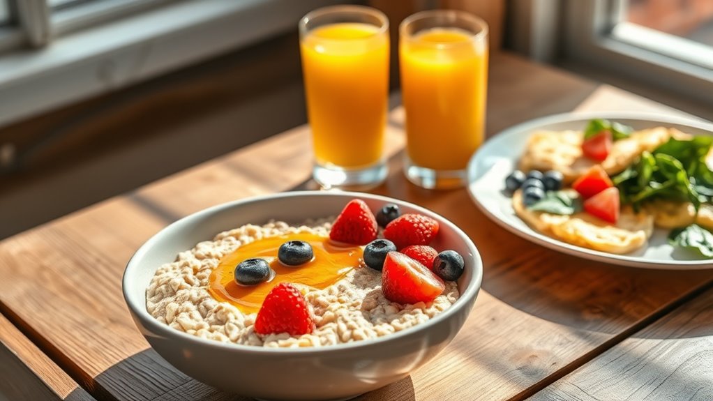 Did you know that eating breakfast within an hour of waking can boost your energy and focus? To support long-term energy, focus on consistent meal timing and include breakfast variety—think proteins, healthy fats, and whole grains. These habits stabilize blood sugar levels and prevent energy dips. Making breakfast a routine and mixing up your meals helps sustain your energy and keeps you motivated throughout the day.