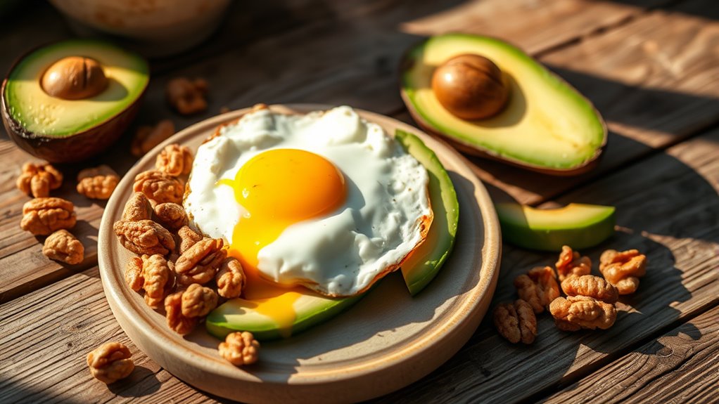 Healthy fats influence your energy levels by supporting hormonal balance, which in turn regulates how your body manages its energy. Consuming healthy fats at breakfast helps maintain hormonal regulation support, essential for breakfast hormone balance. When your hormones are balanced, your body efficiently produces and utilizes energy, preventing crashes later in the day. Healthy fats contribute to: