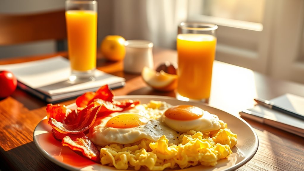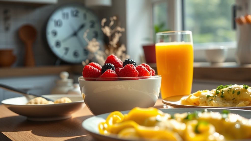 Timing your breakfast correctly can considerably influence your energy levels throughout the day. When you choose the right moment for your meal, you optimize your body’s natural rhythm and maintain steady energy. An ideal eating schedule often involves having breakfast within an hour of waking up to jump-start your metabolism. Consistent meal timing helps regulate blood sugar levels, preventing energy crashes. To get it right, consider: