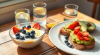 After prioritizing hydration in the morning, fitting in a nutritious breakfast can seem challenging when time is tight. To save time, meal prep is your best ally—prepare overnight oats or make smoothies in advance. These options are versatile and can accommodate various dietary restrictions, such as gluten-free or dairy-free needs. Keep portable options like energy bars or nut butter on hand for busy mornings. If you follow specific dietary restrictions, customize ingredients to meet your requirements without extra fuss. Quick breakfast ideas like boiled eggs, fruit, or yogurt with granola provide essential energy without lengthy prep. By planning ahead and choosing simple, nutrient-dense options, you can fuel your body efficiently even on the busiest mornings.