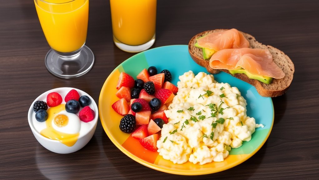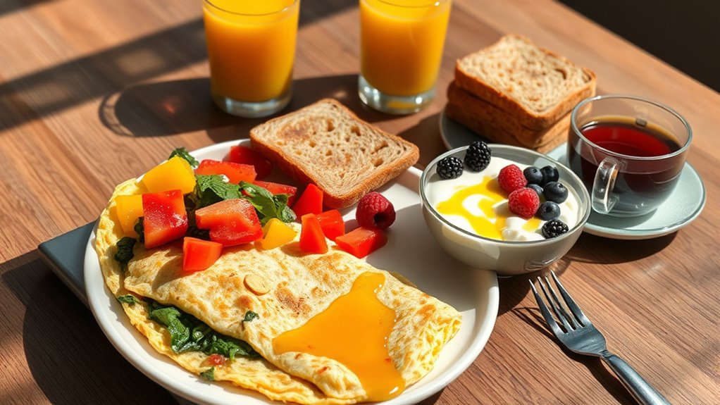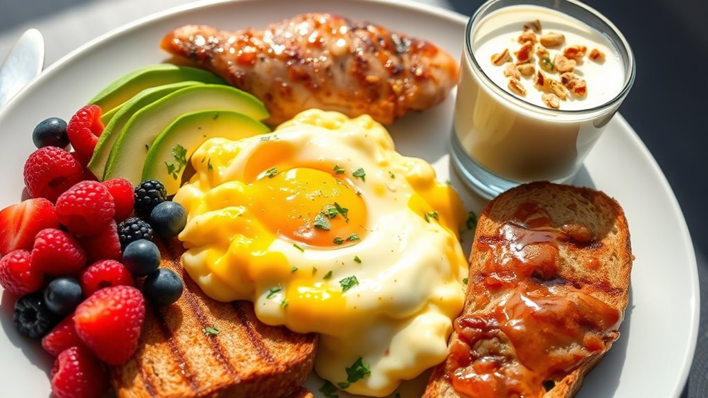 Protein is essential for repairing muscles and keeping you full longer after breakfast. Choosing the right sources guarantees you get all the amino acids your body needs. Balancing protein options helps optimize both recovery and satiety throughout your day. Incorporating a variety of protein sources ensures you maximize benefits and meet your nutritional needs effectively.