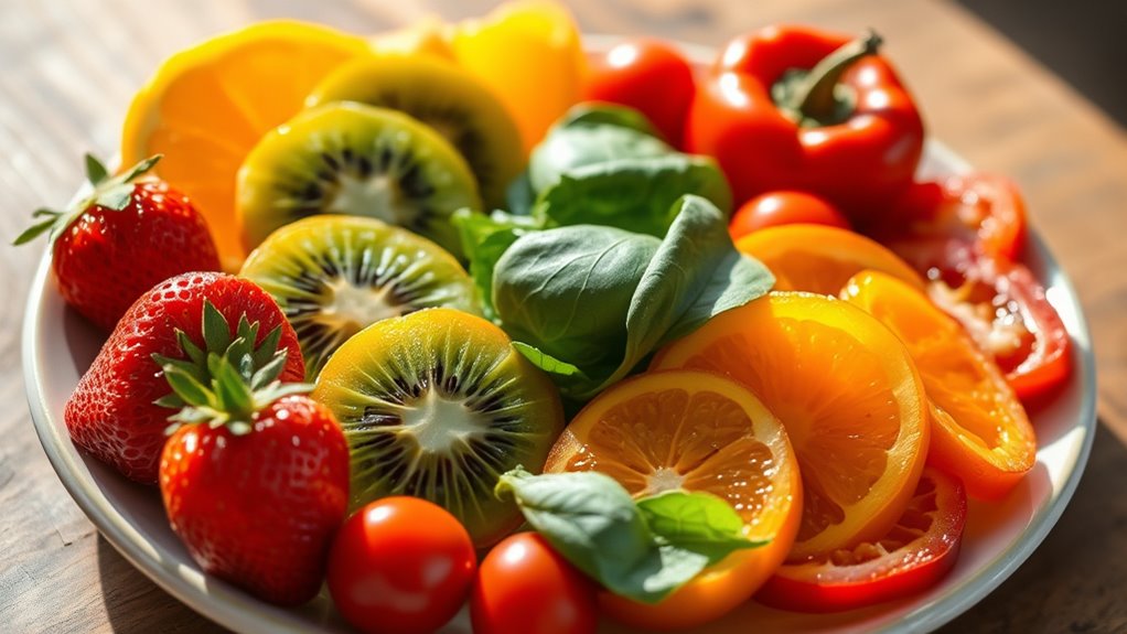 Including a variety of colorful fruits and vegetables in your breakfast not only fuels your body but also strengthens your immune defenses. These foods are rich in vitamins, minerals, and antioxidants that provide critical immune support. Vitamin C from citrus fruits and bell peppers helps your body fight off infections, while antioxidants like carotenoids and flavonoids reduce oxidative stress. Consuming these nutrient-dense options regularly boosts your immune system’s ability to prevent illness, keeping you healthier and more consistent in your training. By prioritizing fruits and vegetables, you give your body the tools it needs to ward off pathogens effectively. Research shows that immune-boosting nutrients play a vital role in maintaining overall health. This approach not only enhances your overall health but also contributes to more reliable performance, making it a smart choice for any athlete aiming to optimize their immune function.