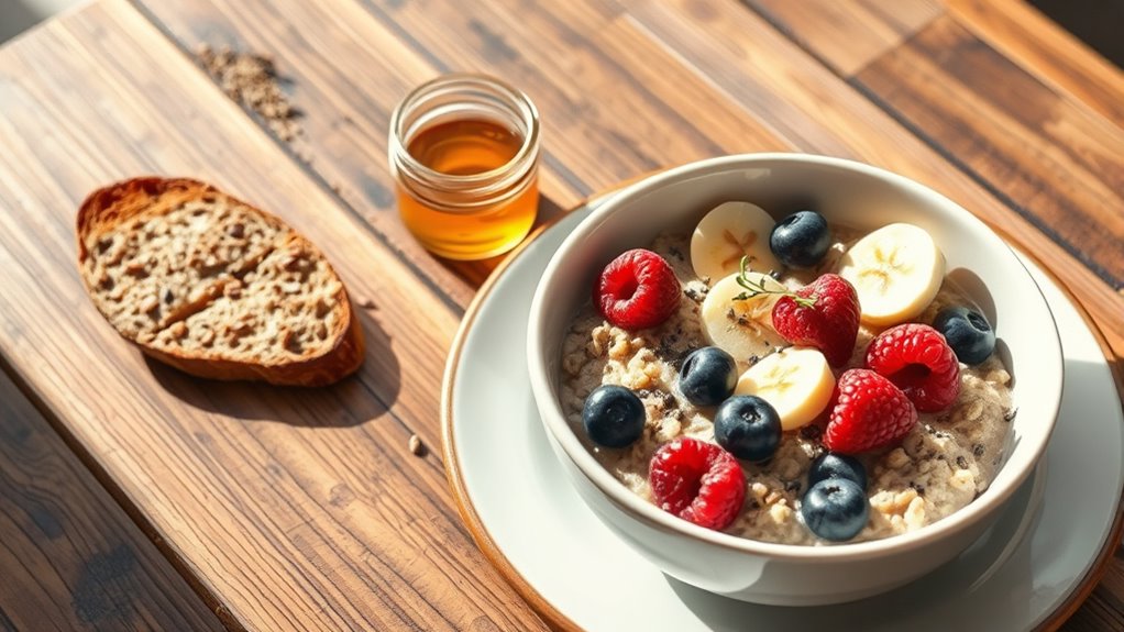 Whole grains form the backbone of a powerful breakfast for athletes because they provide a steady release of energy throughout your training or competition. Their fiber content helps keep you full longer and supports digestion, while grain diversity guarantees you get a variety of nutrients essential for performance. Incorporate different types like oats, quinoa, and whole wheat for maximum benefit. Here’s a quick comparison: