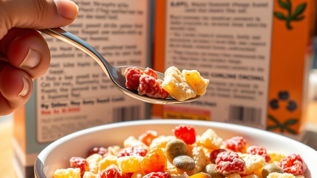 Think of cereal labels as a shiny lure—sometimes, marketing tactics disguise the truth. You should question claims about health benefits because labels often highlight misleading marketing tactics. While ingredient transparency improves, some brands still obscure added sugars or artificial ingredients. Always read the fine print, look beyond bold claims, and check nutritional facts to make informed choices. Don’t be fooled by packaging—your health depends on it.