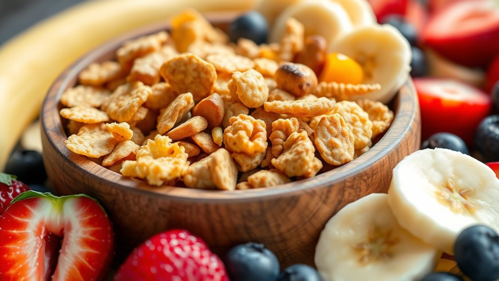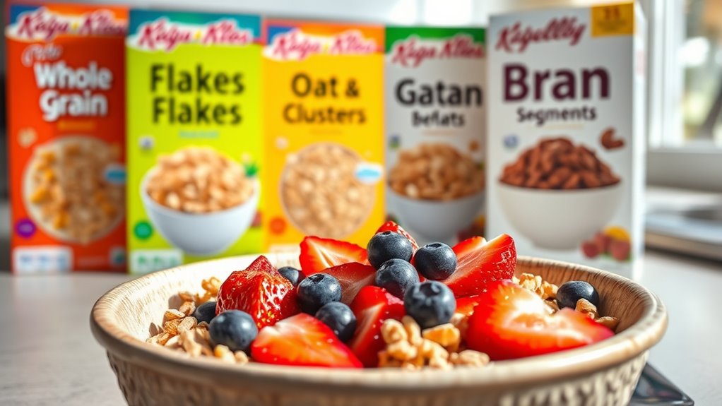 Before choosing a breakfast cereal, understanding your dietary goals and needs is vital. Your meal timing influences the type of cereal that best suits you—if you need quick energy in the morning, opt for options high in carbs and easy to prepare. If you’re aiming for sustained fullness, look for cereals with fiber and protein. Cultural preferences also shape your choices; some cultures favor traditional grains or less processed options. Knowing whether you prefer a light, quick breakfast or a hearty, filling meal helps narrow your options. By evaluating your dietary goals—like weight management, energy levels, or health conditions—you can select cereals that support your needs. Additionally, understanding the role of sound design in creating engaging media can inspire you to incorporate creative elements into your routines or projects, enhancing overall satisfaction. This mindful approach ensures your breakfast aligns with your lifestyle and nutritional priorities.