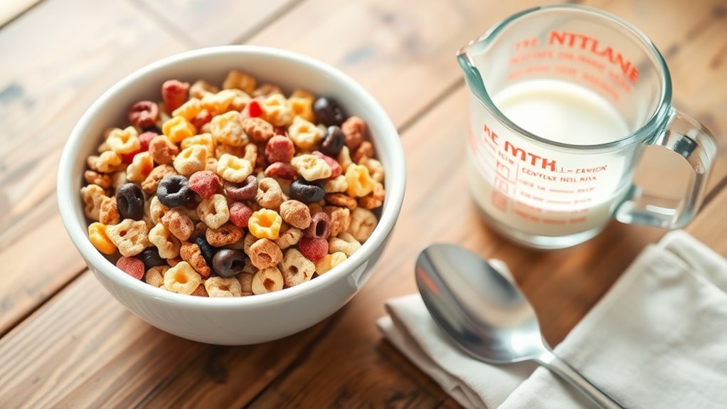 Paying attention to portion sizes and serving suggestions is essential for making healthy cereal choices. Proper portion control helps you avoid overeating and keeps your breakfast balanced. Instead of pouring cereal straight from the box, use measuring cups or a scale to serve a standard portion, usually about one cup. This ensures you’re not unintentionally consuming extra sugar and calories. When serving, consider adding fresh fruit or a splash of milk to enhance flavor without increasing sugar content. Reading nutrition labels and following serving tips on the packaging can also guide you in sticking to appropriate portions. Being mindful of your cereal portions supports your overall health goals and helps reinforce positive habits. Additionally, understanding mental wellbeing can aid in maintaining motivation and consistency in your healthy eating routines.