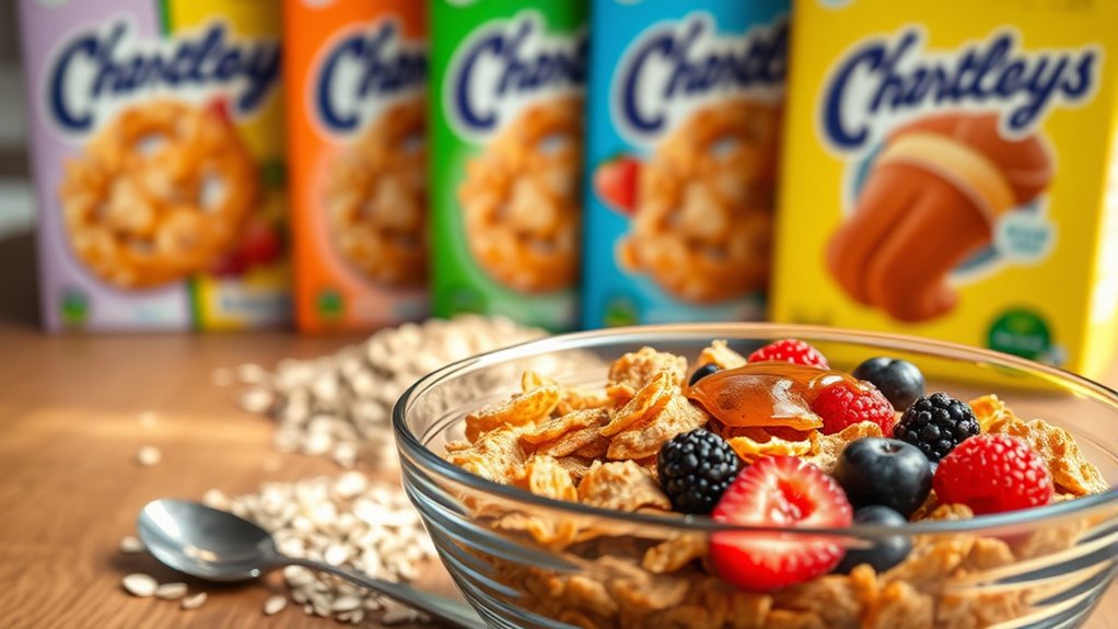 Have you ever noticed how some cereals keep you energized longer than others? Cereal packaging often highlights added protein, which plays a key role in maintaining energy levels. Higher protein cereals help you stay full and alert throughout your morning, aligning with breakfast traditions that emphasize sustained nourishment. When you choose cereals with better protein content, you’re less likely to experience energy crashes before lunch. Look beyond the colorful boxes and check the nutrition label—more protein means better satiety. This impact on energy levels influences how productive and focused you’ll feel during your day. Selecting cereals with balanced protein helps you start your morning on the right foot, supporting your overall health and keeping your energy steady until your next meal.