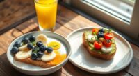 Consuming a plant-based breakfast can considerably reduce your cravings throughout the day. This helps you manage portion control and stick to healthier choices. When you start your day with nutrient-dense foods, you’re less likely to experience sudden hunger spikes. Proper meal timing also plays a role, preventing overeating later on. Plant-based options like fruits, vegetables, and whole grains provide steady energy and keep you full longer. Incorporating these foods early can stabilize blood sugar levels, reducing cravings for processed snacks. To maximize benefits: