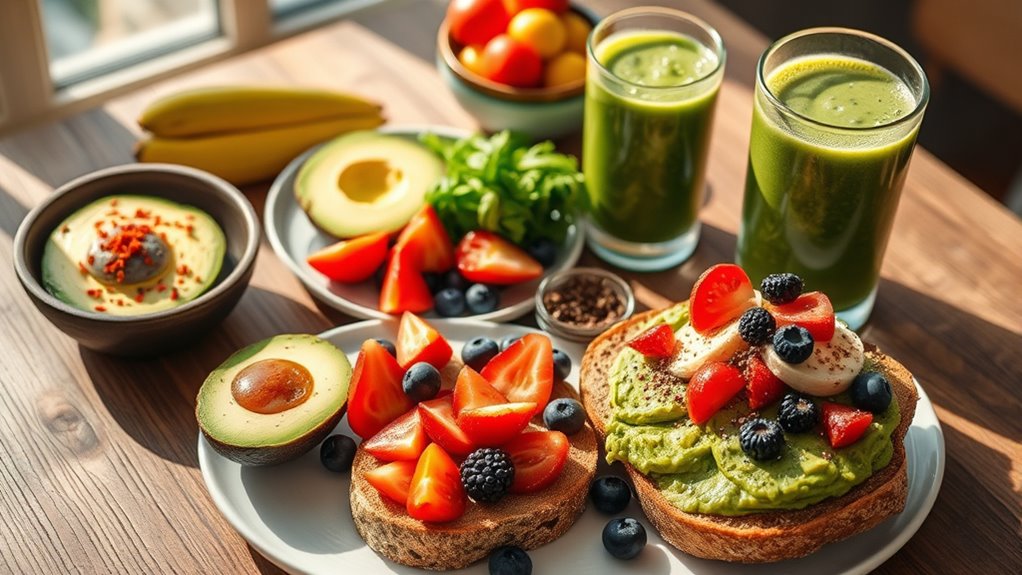 Plant-based breakfasts open up a world of delicious and versatile options that can suit any taste or dietary need. You can easily customize smoothie combinations with your favorite fruits, vegetables, nuts, and seeds for a quick, nutritious start. Breakfast bowls offer another flexible choice, allowing you to layer oats, chia seeds, fresh fruit, and plant-based yogurt for a satisfying meal. These options aren’t only tasty but also adaptable, so you can enjoy them hot or cold, sweet or savory. Traditional dishes from around the globe can also be adapted into plant-based versions, adding cultural diversity to your breakfast table. Whether you prefer a invigorating smoothie or a hearty breakfast bowl, plant-based foods give you endless possibilities to keep your mornings exciting and nourishing. Plus, their variety means you won’t get bored and can always find something that fits your mood or dietary goals.