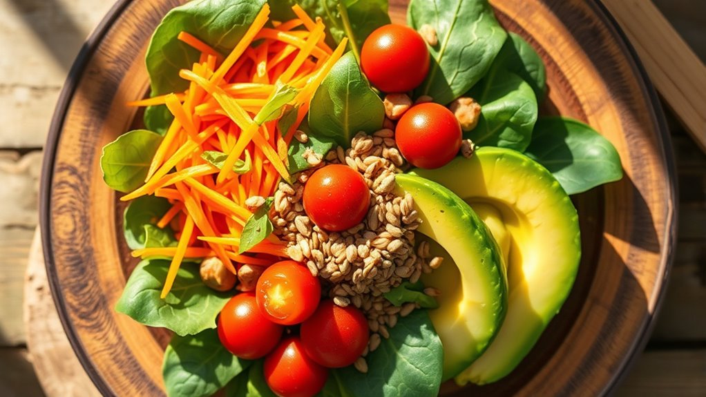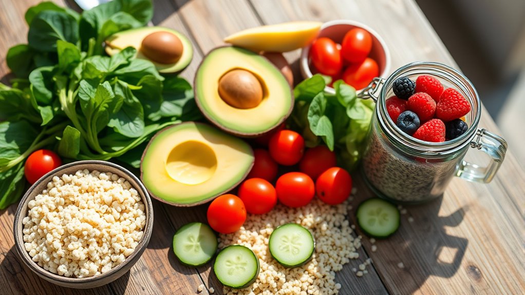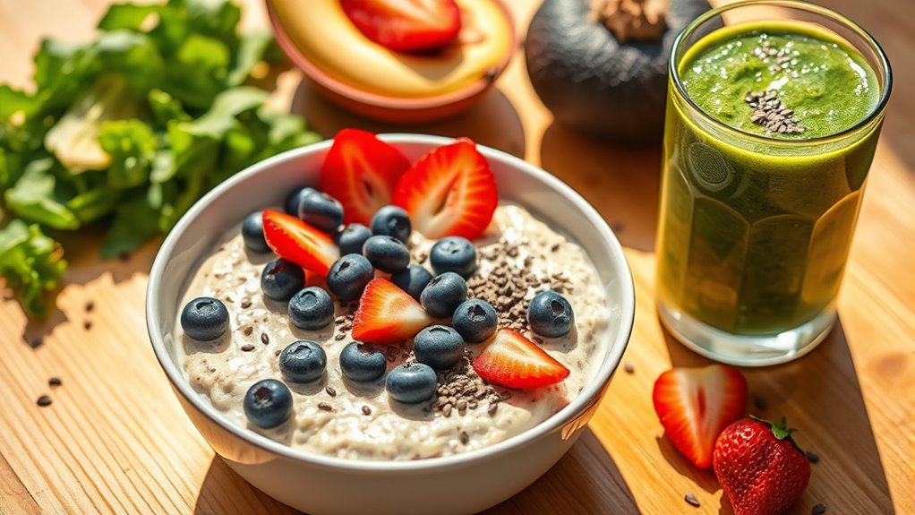 Since plant-based foods are high in fiber and water content, they naturally promote feelings of fullness and satisfaction. The fiber content slows digestion, keeping you full longer and helping regulate hunger cues. Additionally, fiber stimulates the release of satiety hormones, which signal your brain that you’re full. These effects work together to reduce overall calorie intake, supporting weight management. Eating a breakfast rich in plant-based foods ensures you start your day with sustained energy and reduced likelihood of snacking later. By emphasizing fiber and satiety hormones, plant-based breakfasts help you feel satisfied without overeating, making it easier to maintain a healthy weight over time. Incorporating these foods into your morning routine can be a simple yet effective way to support your health goals. Raw food diets can also contribute to feelings of fullness by promoting natural chewing and digestion.