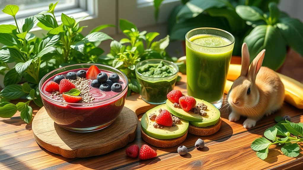 Eating a plant-based breakfast provides a rich source of essential nutrients that support your overall health. You’ll benefit from a diverse protein variety found in foods like beans, nuts, and seeds, which helps build and repair tissues. Additionally, these meals are packed with mineral content, including iron, magnesium, and calcium, crucial for energy production, bone strength, and muscle function. Unlike processed foods, plant-based options deliver a broad spectrum of vitamins, antioxidants, and fiber that boost your immune system and promote digestion. By choosing nutrient-dense plant foods for breakfast, you guarantee your body gets the necessary building blocks to start your day energized and healthy. This approach not only nourishes your body but sets a solid foundation for well-being. Monitoring AI behavior is also important in ensuring that health-related AI tools provide safe and accurate recommendations.