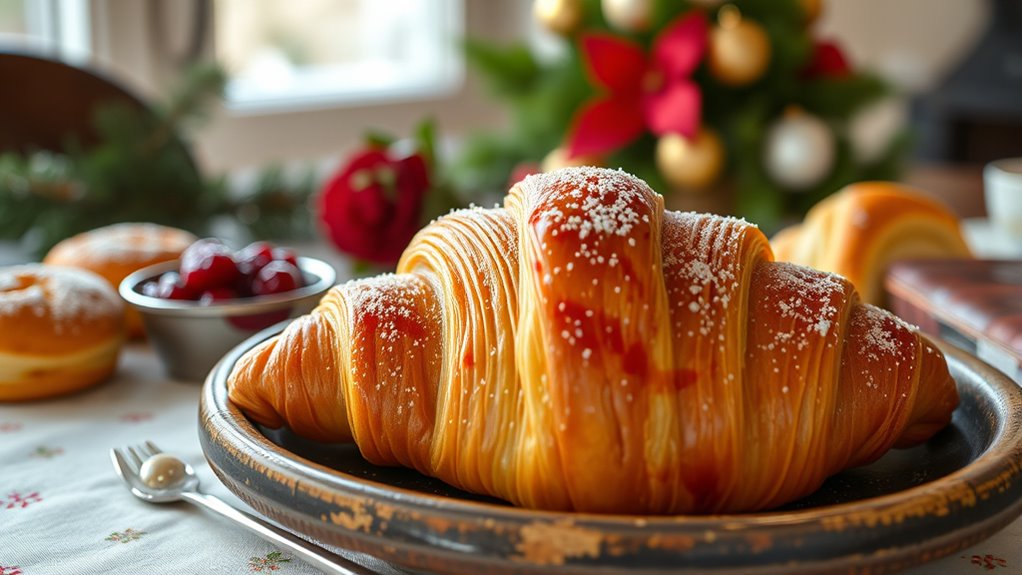 Have you ever wondered why flaky, buttery croissants have become a Christmas morning favorite in many households? It’s because of French pastry art that masters the craft of creating perfect croissants with delicate layers. You can enjoy traditional croissants or explore delightful croissant variations like almond, chocolate, or ham and cheese. These pastries add elegance and flavor to your festive breakfast. To inspire your selection, here’s a quick guide: