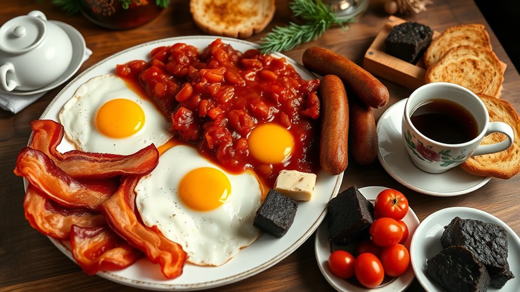 A traditional British full breakfast typically includes eggs, bacon, sausages, and baked beans, but regional preferences add variety. You might find black pudding in the north or kippers along the coast, reflecting local tastes. These components often come with perfect pairings like toast, fresh tomatoes, or mushrooms to complete the meal. Incorporating local culinary traditions can further enhance the breakfast experience.