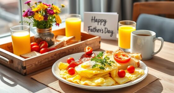 While traditional Easter breakfast customs celebrate spring’s renewal through colorful eggs and floral displays, many families are now adding modern twists to these time-honored routines. Instead of sticking to classic dishes, you might enjoy a lively Easter brunch featuring avocado toast, quiche, or smoothie bowls. To elevate the occasion, incorporate creative breakfast cocktails like mimosas or Bloody Marys, adding a festive touch to your morning. These modern twists make your Easter celebration more relaxed and personalized, blending tradition with contemporary flavors. You can also experiment with plant-based options or international-inspired dishes, making your Easter breakfast both fresh and inclusive. Embracing these updates keeps the celebration exciting and relevant, while still honoring the spirit of renewal and togetherness.