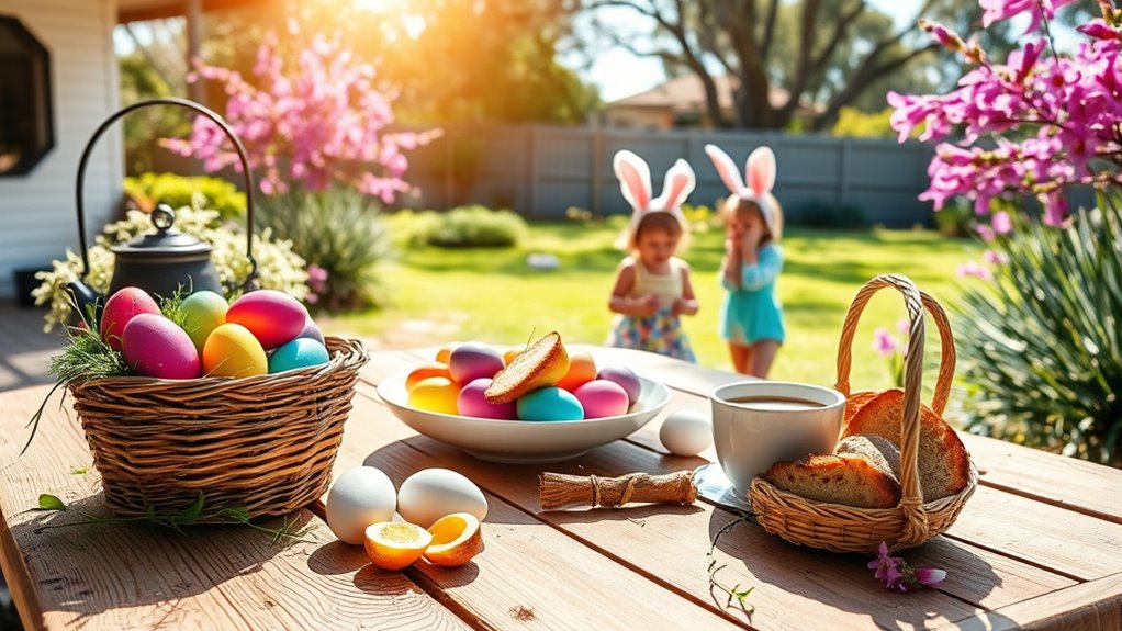 Traditional European Easter morning feasts often feature a variety of hearty and symbolic dishes that families gather around to celebrate the holiday. As you enjoy the meal, vibrant spring flowers bloom nearby, symbolizing renewal and new life. Kids enthusiastic participate in Easter egg hunts, searching for colorful eggs hidden among the blossoms, adding a festive spirit to the morning. These celebrations often include bread, cured meats, and cheeses, emphasizing the importance of community and tradition. The aroma of fresh baked goods mingles with the scent of springtime blooms, creating a warm, inviting atmosphere. Incorporating rustic decor and vintage tableware enhances the authentic farmhouse ambiance of these festive gatherings. This blend of hearty food, lively hunts, and blooming flowers captures the essence of a joyful, renewal-focused Easter morning across many European cultures.