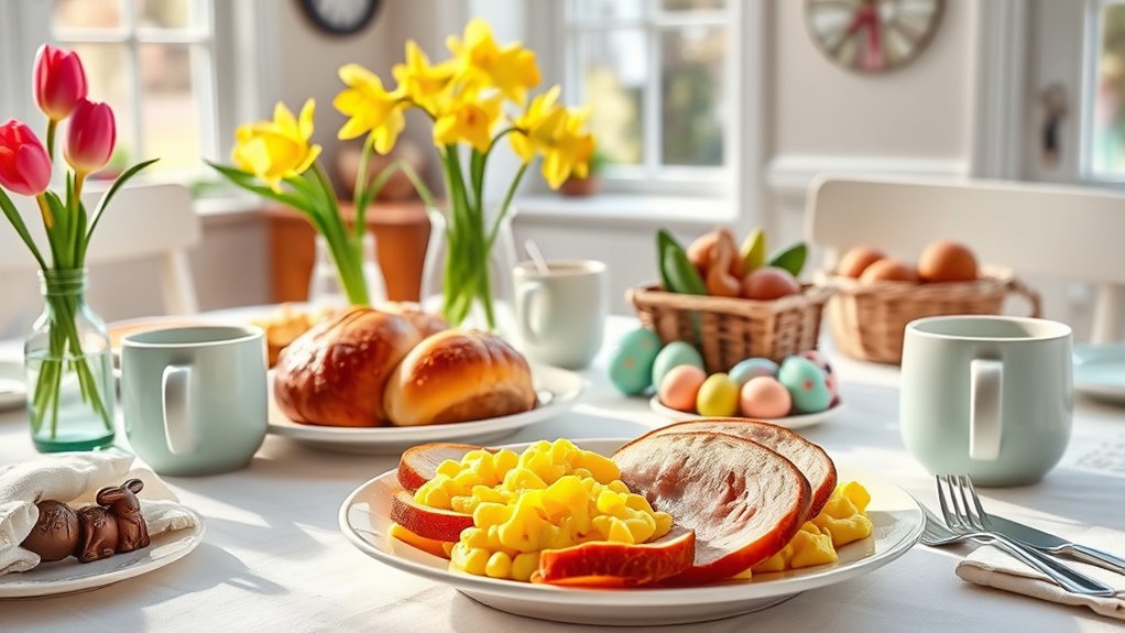 During Easter celebrations in Australia and New Zealand, families often start their mornings with a variety of beloved breakfast foods that reflect local tastes and traditions. You might enjoy hearty options like bacon, eggs, and freshly baked bread or pastries. Easter egg hunts are a favorite activity afterward, so many prepare special treats like chocolate eggs or hot cross buns to enjoy with family. Spring flower arrangements add a festive touch to the table, bringing vibrant colors and fresh scents to the celebration. These breakfast customs blend local flavors with the joyful spirit of the holiday, creating a warm, inviting start to your Easter morning. Whether you opt for simple or elaborate dishes, the focus remains on gathering with loved ones and celebrating the season.
