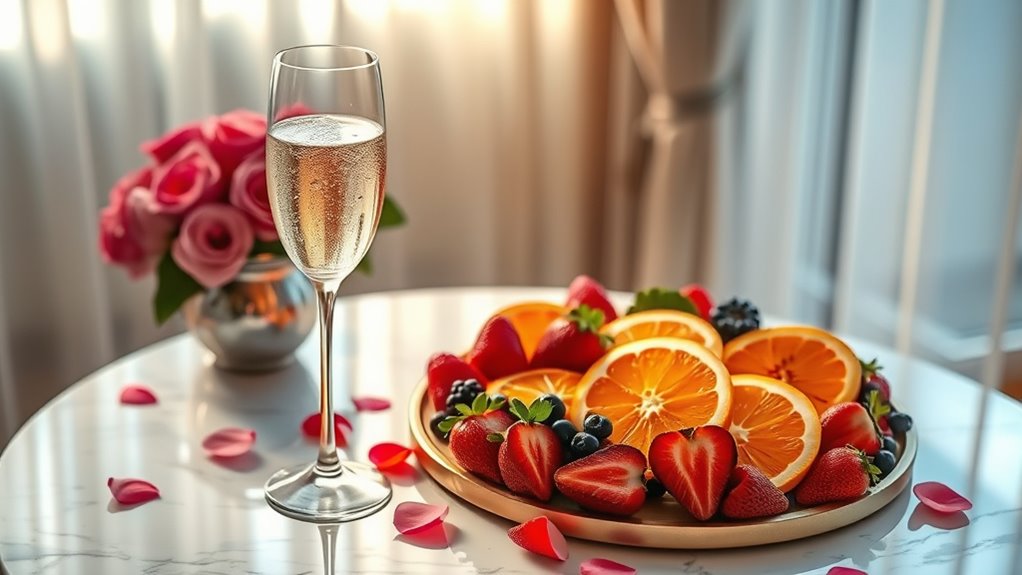 After enjoying the sweet and romantic start with heart-shaped pancakes, elevate the celebration by setting up a champagne and fruit mimosa bar. You can offer a variety of champagne cocktails, allowing you and your partner to customize each drink. Fill glasses with chilled champagne and provide an assortment of fruit garnishes like strawberries, raspberries, orange slices, and pomegranate seeds. These vibrant additions not only enhance the flavor but also add a festive look. Encourage your loved one to mix and match, creating personalized mimosas that match your mood. This interactive setup turns breakfast into a fun, intimate experience. Plus, the combination of bubbly champagne and fresh fruit makes for a light, invigorating start to your special day.