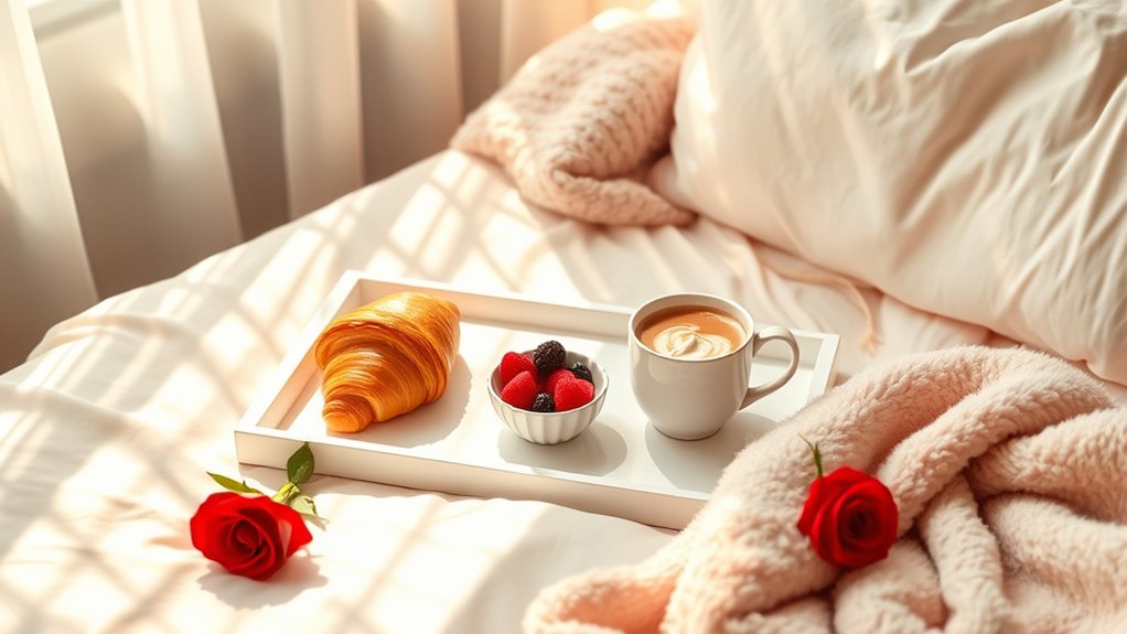 Creating a cozy bedroom setting transforms a simple breakfast into an intimate and memorable experience. You can enhance the mood with thoughtful bedroom decor, like soft linens and romantic touches. Let the morning sunlight spill gently through the windows, casting a warm glow over the space. To set the scene, consider dimming the lights or adding candles for a softer ambiance. Keep everything within easy reach—fresh flowers, a tray, and your favorite breakfast items—so you can focus on your partner. Incorporate plush pillows and cozy blankets to invite relaxation. The right atmosphere makes your breakfast feel special, turning an ordinary morning into a cherished moment together. Small details, like lighting and decor, elevate the experience effortlessly. Paying attention to creating a warm environment can further enhance the romantic mood.