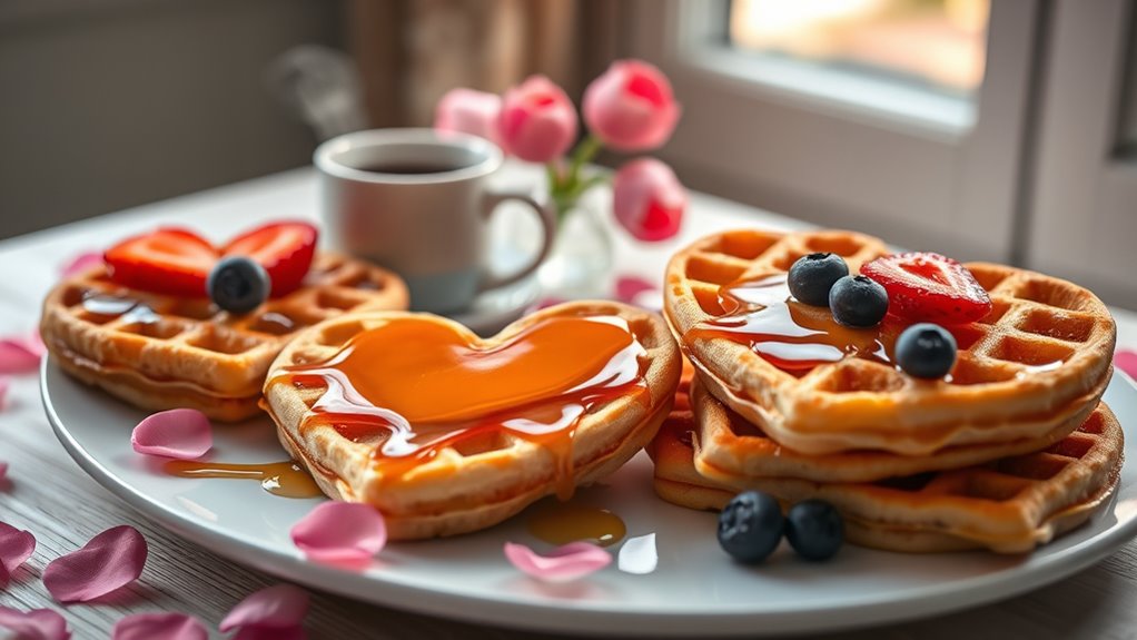 Building on the indulgence of rich chocolate pancakes, heart-shaped waffles add a charming and festive touch to your Valentine’s Day breakfast. As you prepare these waffles, consider using your favorite pancake toppings like fresh berries, whipped cream, or a drizzle of syrup to enhance their appeal. Their distinctive shape makes them perfect for breakfast decoration, instantly elevating the meal’s visual appeal. Serve them on a pretty plate, maybe with a dusting of powdered sugar or a sprig of mint for extra flair. You can also add a few chocolate shavings or heart-shaped fruit slices for an extra romantic touch. These waffles not only taste delicious but also create a memorable, love-filled start to your special day.