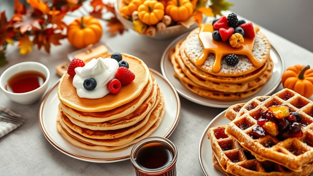 Whether you prefer sweet or savory flavors, pancakes and waffles offer a versatile canvas for festive toppings and fillings that can elevate your Thanksgiving breakfast. For a sweet twist, sprinkle pumpkin spice into your batter and top with whipped cream, caramelized apples, or toasted pecans for a warm, comforting flavor. For a savory option, try bacon-wrapped pancakes, where crispy bacon encases fluffy batter, creating a delicious balance of salty and sweet. You can also add cheddar cheese, herbs, or sautéed vegetables to the batter for extra flavor. Drizzle with maple syrup or honey to finish. These ideas allow you to customize your breakfast while celebrating the season’s flavors, making your Thanksgiving morning both memorable and satisfying.