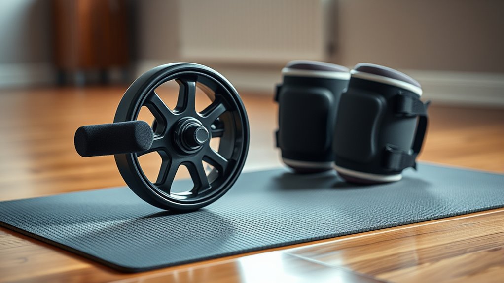 When selecting an ab roller wheel with knee pads, ease of use is key to ensuring a smooth and effective workout. I look for wide, stable wheels that prevent wobbling and help maintain balance, especially for beginners. Ergonomic handles with non-slip grips, like foam or rubber, make controlling the roller comfortable and secure, reducing the risk of slips and improper form. Adjustable resistance or rebound mechanisms allow customization, making exercises easier or more challenging without needing extra equipment. Supportive accessories like knee pads and elbow supports minimize discomfort, enabling longer sessions. Lastly, simple assembly and lightweight design are important for quick setup and portability, so I can start my workout anytime and anywhere without hassle.