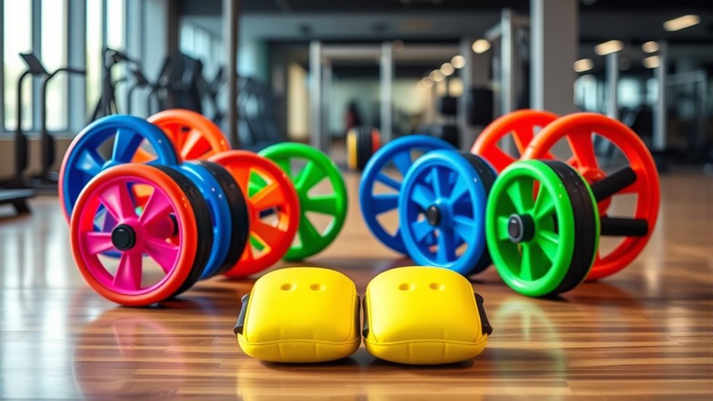 In selecting an ab roller wheel with knee pads, considering the resistance features can make a significant difference in your workout effectiveness. Resistance options like elastic springs, magnetic resistance, or adjustable tension mechanisms allow you to customize intensity levels, helping you challenge your muscles more effectively. Some models include automatic rebound systems that offer controlled resistance during both push and pull actions, boosting muscle engagement. For beginners, resistance springs can reduce strain and provide smoother movements, making workouts more comfortable. As you grow stronger, adjustable resistance settings enable you to progressively increase difficulty, supporting long-term progress. These features ensure your core activation is maximized, enhancing fat burning and muscle toning, and ultimately delivering a more efficient and versatile workout experience.