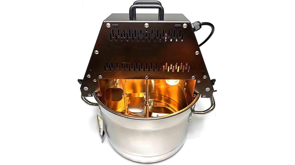 For anyone cooking large batches of sauces, jams, or long-simmering dishes, the Automatic Pot Stirrer for Cooking offers a hands-free solution that guarantees thorough mixing without constant supervision. Its stainless steel construction with double stirring paddles ensures efficient, uniform stirring of up to 10 liters. Equipped with a powerful copper coil motor and an auxiliary fan, it handles sticky foods like custards and sauces effortlessly. The scraper holder prevents food from sticking, while the built-in light provides clear visibility. Perfect for professional kitchens or home cooks, this device simplifies long cooking processes, guaranteeing consistent flavor and texture every time.