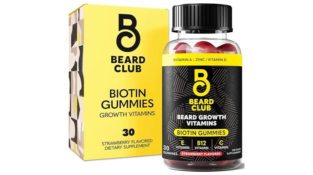 If you’re looking to boost beard growth along with overall hair, skin, and nail health, these vegan Biotin 5000 mcg Gummies are an excellent choice. They combine a high dose of biotin with nine other essential vitamins and minerals, supporting healthy hair and skin from the inside out. Users report noticeable improvements in skin smoothness, faster hair growth, and stronger nails. The gummies are easy to incorporate into your daily routine and have a pleasant taste. With consistent use, you’ll likely see enhanced beard fullness and overall wellness, making these gummies a convenient and effective supplement for your grooming goals.