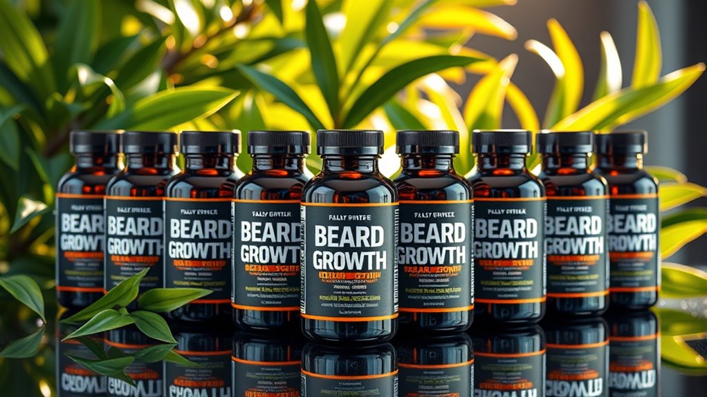 Choosing the right beard growth vitamin often means considering more than just its ingredients; scent and flavor options can substantially impact your daily routine. Many vitamins come in flavors like strawberry, vanilla, citrus, or natural fruit blends, making supplementation more enjoyable. Beard oils often feature masculine scents such as sandalwood or cedarwood, which add a subtle, grooming-friendly aroma. The right scent or flavor can boost your consistency, as pleasant options make daily use more appealing. Some products also offer unscented or lightly scented versions for those sensitive to strong fragrances. Ultimately, selecting a flavor or scent that you enjoy encourages regular use, helping you stick to your beard growth routine and achieve better results over time.