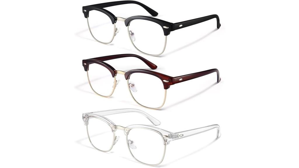 Looking for blue-light blocking glasses that suit both women and men? These vintage half-frame glasses with UV clear lenses offer a stylish, versatile look suitable for all face shapes. They block up to 90% of blue light, reducing eye strain, dryness, and fatigue from screen exposure. Made from lightweight, high-quality composite materials, they’re comfortable for extended wear during work, gaming, or outdoor activities. While not the most durable, they effectively protect your eyes and help improve sleep. Many users find them stylish and functional, making them a great budget-friendly option for anyone seeking eye relief without sacrificing style.