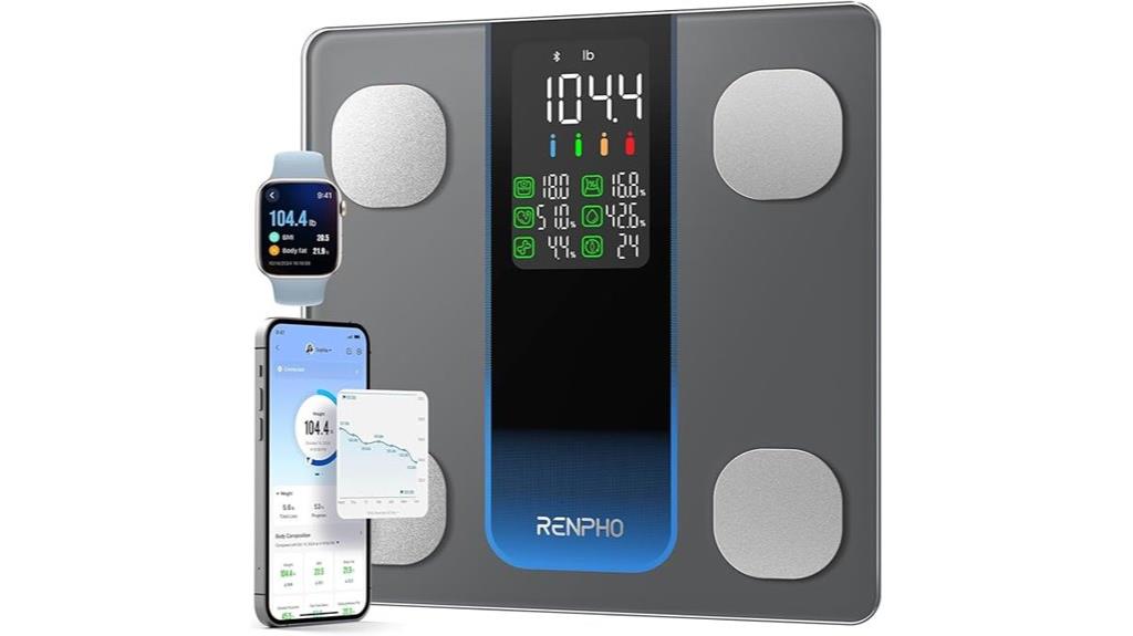 For those who want a thorough view of their health, the RENPHO Smart Body Scale with 7-in-1 Body Composition offers detailed metrics like BMI, body fat, muscle mass, water percentage, bone mass, and metabolic age, all displayed on a large LED screen. It supports up to 500 pounds and features a sleek tempered glass design. Using Bioelectrical Impedance Analysis, it provides accurate measurements with four high-sensitivity electrodes and sensors. The scale connects seamlessly via Bluetooth to the Renpho app, supporting multiple users and syncing with major health platforms. Its quick readings, user-friendly setup, and exhaustive data make it a top choice for health-conscious users.